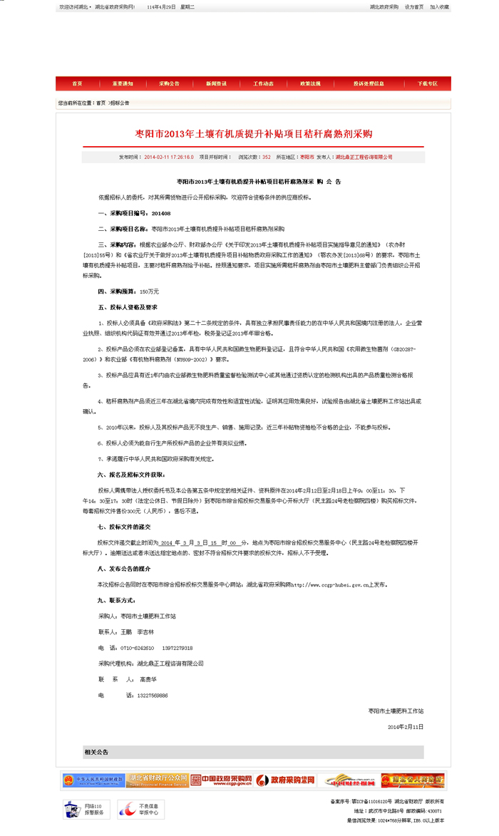 棗陽(yáng)市2013年土壤有機(jī)質(zhì)提升補(bǔ)貼項(xiàng)目秸稈腐熟劑采購(gòu)