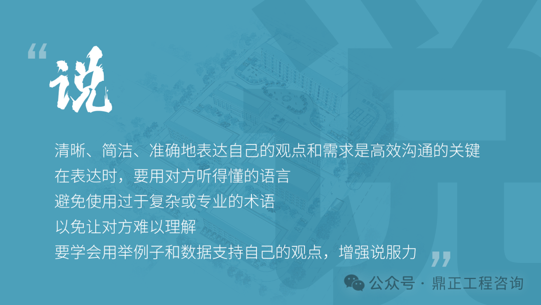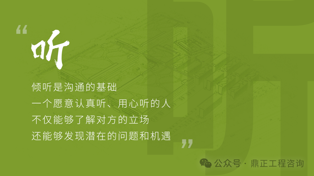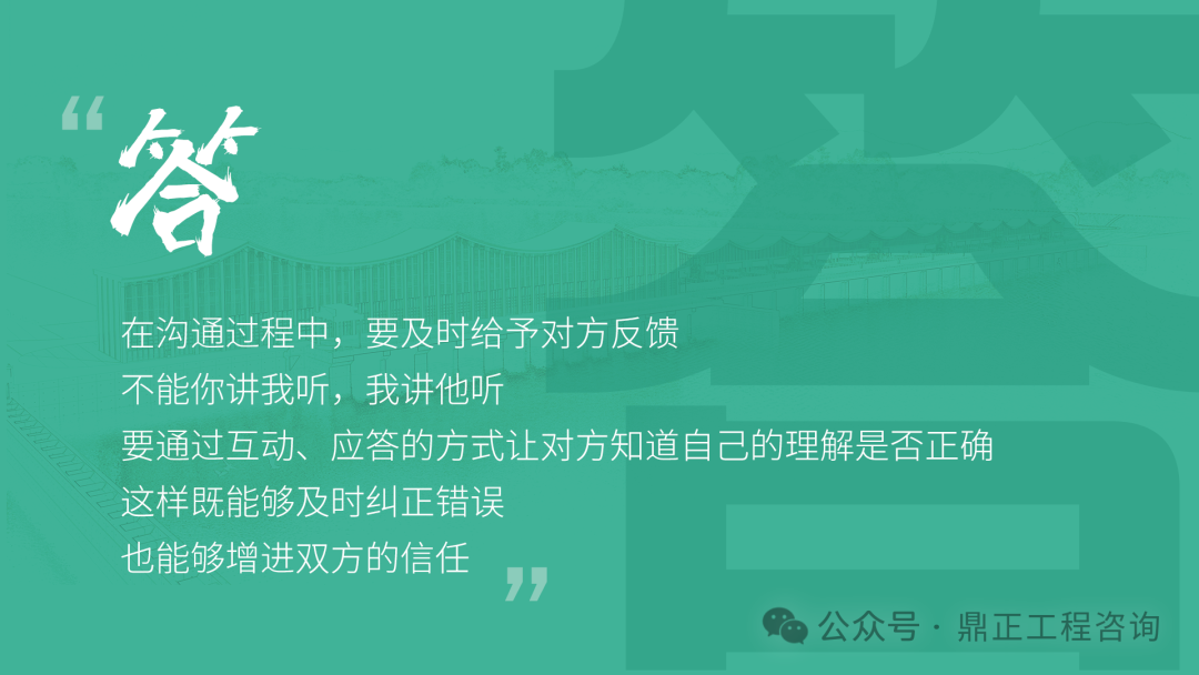 交流要看對象,不能對牛彈琴。與農(nóng)民工交流要用農(nóng)民工聽得懂的語言;與同行或其他咨詢機構交流要用專業(yè)語言;與直接上級交流要及時反饋并提出合理建議;與客戶交流,要從客戶的視角出發(fā),為其提供最優(yōu)解決方案。