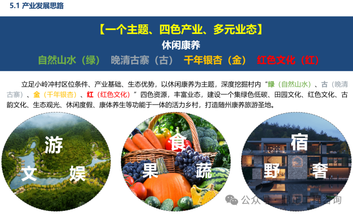 其中,雙河村通過發(fā)揮特色農(nóng)業(yè)產(chǎn)業(yè)優(yōu)勢建設(shè)農(nóng)業(yè)品牌,延伸農(nóng)業(yè)加工產(chǎn)業(yè)鏈開啟創(chuàng)收新征程,積極發(fā)展鄉(xiāng)村休閑業(yè)打造詩意田園水鄉(xiāng),主要打造田園綜合體、濱河休閑體驗,拓展農(nóng)業(yè)休閑旅游業(yè)態(tài)。泉水寺村重點(diǎn)結(jié)合國家級專用汽車和應(yīng)急裝備檢測研發(fā)基地的建設(shè)基礎(chǔ),構(gòu)建以產(chǎn)業(yè)基地配套服務(wù)為主導(dǎo),以生態(tài)種養(yǎng)、休閑農(nóng)業(yè)為特色的產(chǎn)業(yè)體系。小嶺沖村重點(diǎn)整合“綠(自然山水)、古(晚清古寨)、金(千年銀杏)、紅(紅色文化)”四色資源,構(gòu)建“綠+古+金+紅”四色產(chǎn)業(yè),打造品質(zhì)活力鄉(xiāng)村旅游。九口堰村重點(diǎn)以豐富的紅色文化、自然資源為基礎(chǔ),以紅色文化體驗為主導(dǎo)產(chǎn)業(yè),以文化帶動旅游,拓展紅色體驗、康養(yǎng)度假等產(chǎn)業(yè),打造全國紅色教育示范基地。
