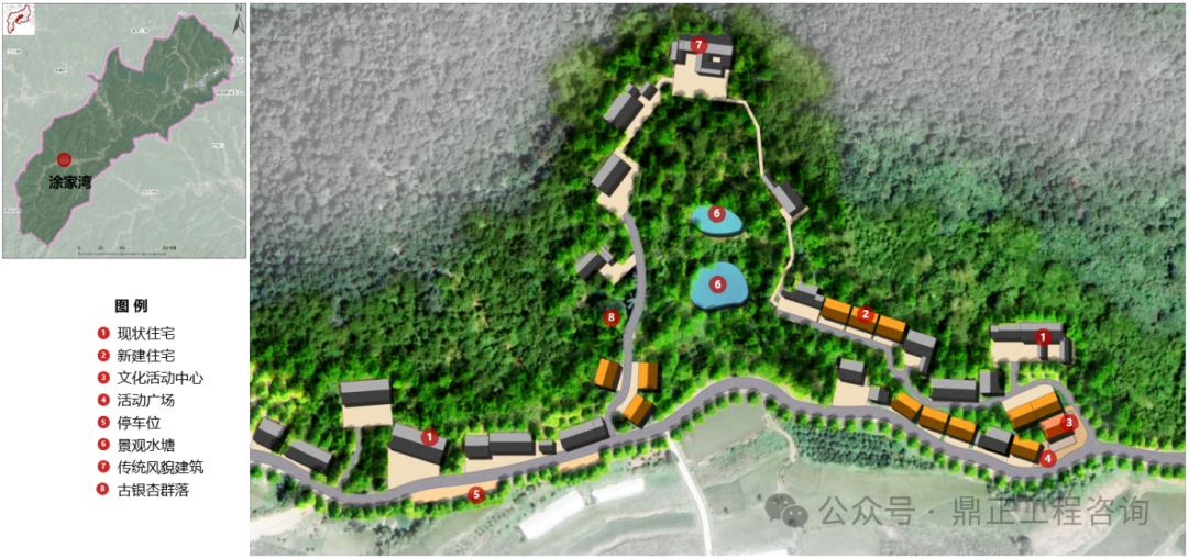 九口堰村為滿足村莊集并及遠(yuǎn)期人口增長需求,規(guī)劃于涂家灣設(shè)置一處居民安置點(diǎn)。場地現(xiàn)狀民居較多,地形高差大,通過梳理現(xiàn)狀閑置宅基地、拆除破舊房屋等措施整理出可以進(jìn)行布局居民點(diǎn)的建設(shè)用地,點(diǎn)狀布局居民點(diǎn),居民點(diǎn)每戶占地140平方米,共安置12戶。