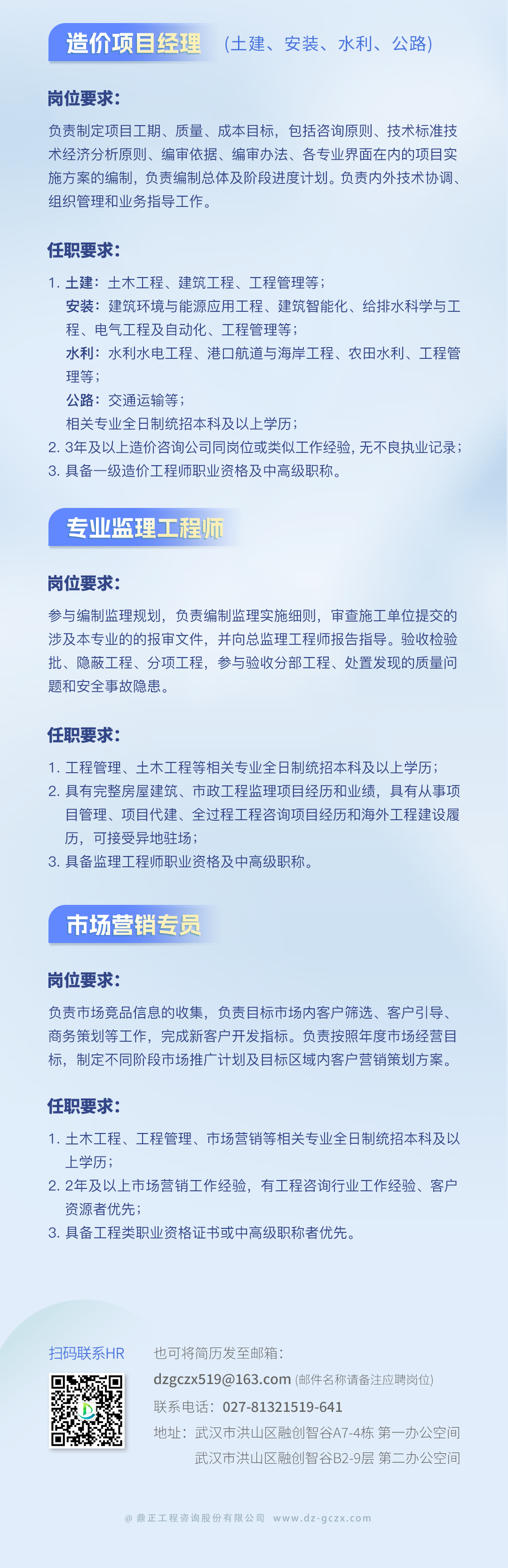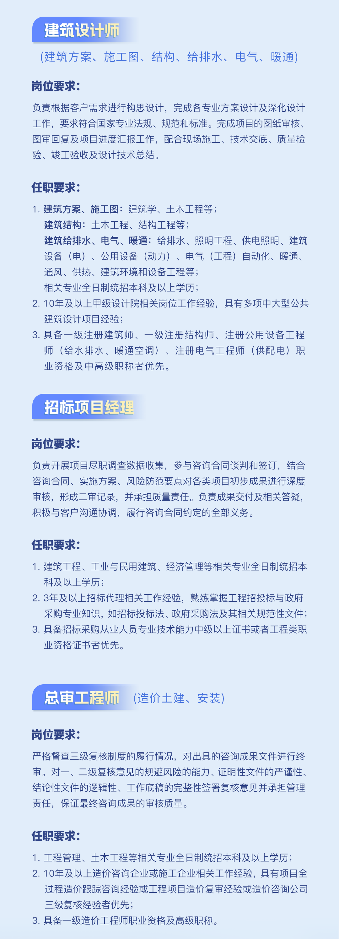 公司下設(shè)工程咨詢(xún)事業(yè)部、招標(biāo)代理事業(yè)部、工程造價(jià)咨詢(xún)事業(yè)部、規(guī)劃設(shè)計(jì)事業(yè)部等機(jī)構(gòu)...