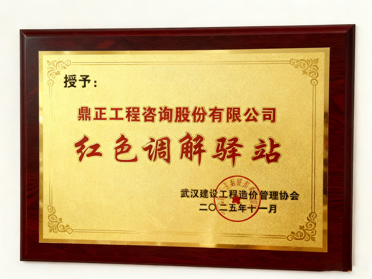 11月18日上午,武漢建設(shè)工程造價(jià)管理協(xié)會第四屆理事會第七次會議順利召開。會議期間舉行了“紅色調(diào)解驛站”首批協(xié)同創(chuàng)建單位授牌儀式,鼎正成功入選并獲授“紅色調(diào)解驛站”稱號。