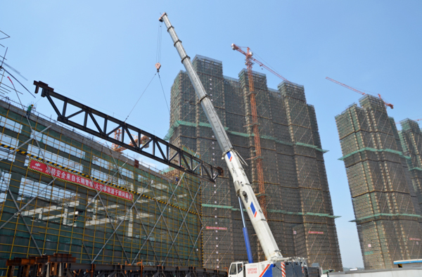 ??? On 30th May, a combination of trusses of 100 tons was successfully slipped at high altitude of Qingshan Lake construction site, which is being constructed by Zhejiang HangXiao Steel Structure Co., Ltd.. This combination of truss is used for a banquet hall in hotel podium at A1 area of Yuexiu Urban Complex (phase 1) in Qingshan Lake Science & Technology Park.