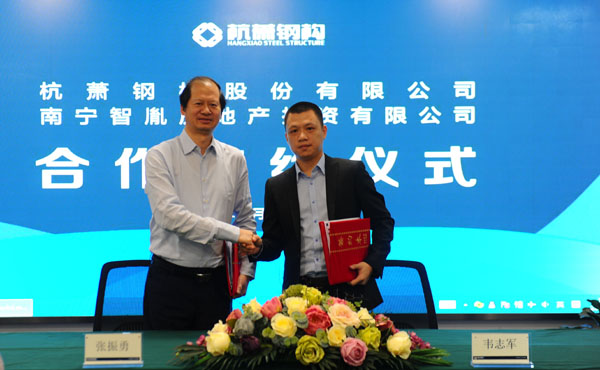 此次戰(zhàn)略合作簽約儀式在杭蕭鋼構(gòu)總部杭州瑞豐國(guó)際商務(wù)大廈舉行。協(xié)議由杭蕭鋼構(gòu)總裁張振勇與南寧智胤總經(jīng)理韋志軍共同簽署。