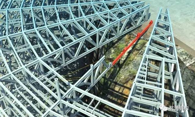 第二步:吊裝第一分段的上弦桿,并拉舍鋼絲繩