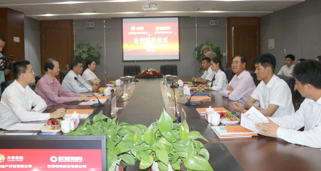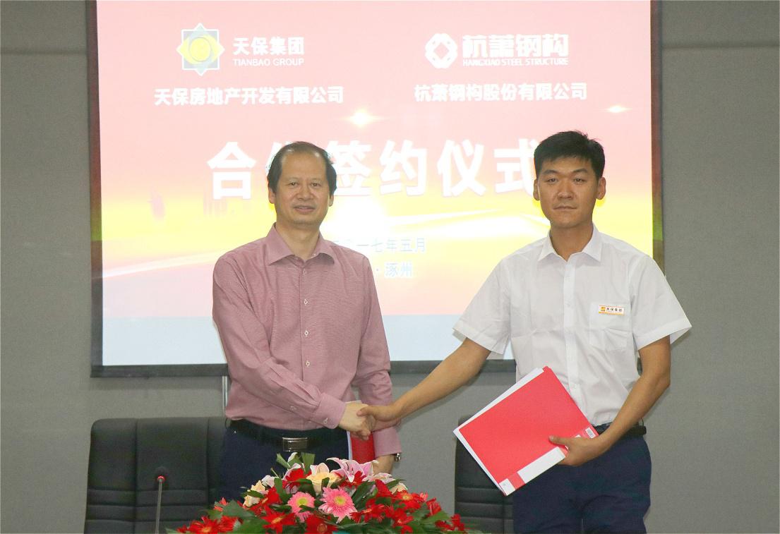 天保集團(tuán)黨委書記、董事長李保田,杭蕭鋼構(gòu)董事、總裁張振勇,杭蕭鋼構(gòu)副總裁壽林平等出席杭蕭鋼構(gòu)與天保房產(chǎn)合作簽約儀式