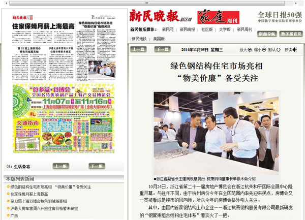 2014年11月5日,《新民晚報》第P03版《生活備忘》報道:《綠色鋼結構住宅市場亮相? “物美價廉”備受關注》。