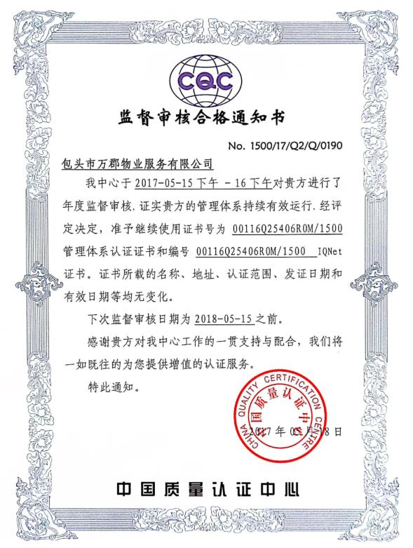 隨后審評(píng)專家開(kāi)始對(duì)各部門服務(wù)流程及工作內(nèi)容進(jìn)行現(xiàn)場(chǎng)審核。公司各部門全力配合審評(píng)專家進(jìn)行此次年審工作,積極講解服務(wù)細(xì)則,及時(shí)為專家提供相關(guān)資料。經(jīng)過(guò)兩天的審核工作,在5月16日14:00召開(kāi)末次會(huì)議,審評(píng)專家宣布,對(duì)我公司不開(kāi)具工作不足整改項(xiàng)目,即各項(xiàng)工作指標(biāo)基本達(dá)到認(rèn)證要求。公司也于2017年5月22日正式收到中國(guó)質(zhì)量認(rèn)證中心發(fā)送的監(jiān)督審核合格通知書,標(biāo)志著成功通過(guò)2017年度ISO9000認(rèn)證年審,證書可繼續(xù)保持使用。
