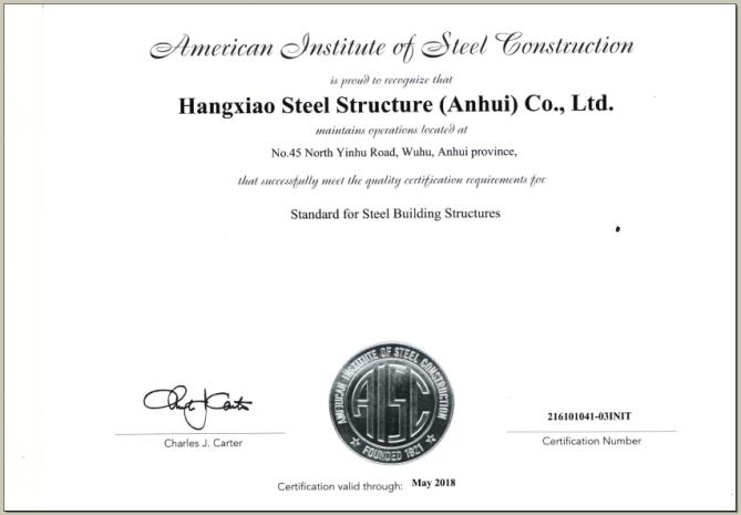 2017年5月23日杭蕭鋼構(gòu)(安徽)有限公司收到了由AISC美國(guó)鋼結(jié)構(gòu)協(xié)會(huì)發(fā)來(lái)的賀信和認(rèn)證證書,這標(biāo)志著杭蕭鋼構(gòu)(安徽)順利通過(guò)了美標(biāo)首次認(rèn)證,這為公司推行美標(biāo)產(chǎn)品控制標(biāo)準(zhǔn)提供了強(qiáng)有力的支持。