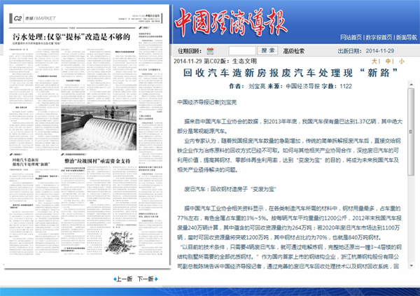 2014年11月29日,《中國經(jīng)濟(jì)導(dǎo)報(bào)》第C02版《生態(tài)文明》報(bào)道:《回收汽車造新房報(bào)廢汽車處理現(xiàn)“新路”》。