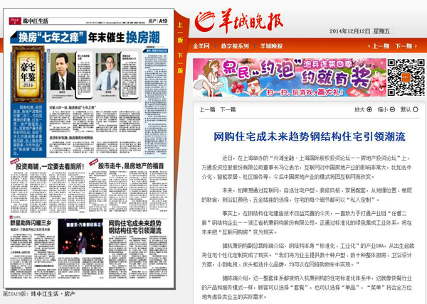 2014年12月12日,《羊城晚報》第A19版《房產(chǎn)》報道:《網(wǎng)購住宅成未來趨勢 鋼結(jié)構(gòu)住宅引領(lǐng)潮流》。