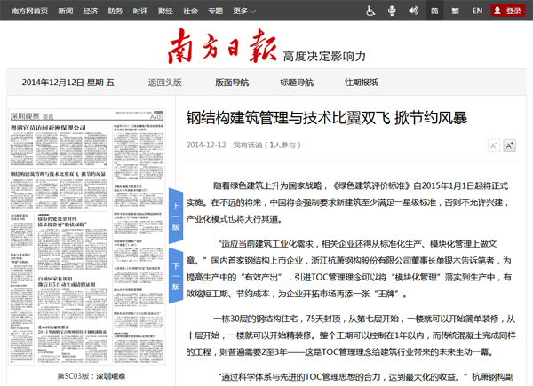 2014年12月12日,《南方日?qǐng)?bào)》第A03版《深圳觀察》報(bào)道:《鋼結(jié)構(gòu)建筑管理與技術(shù)比翼雙飛 掀節(jié)約風(fēng)暴》。