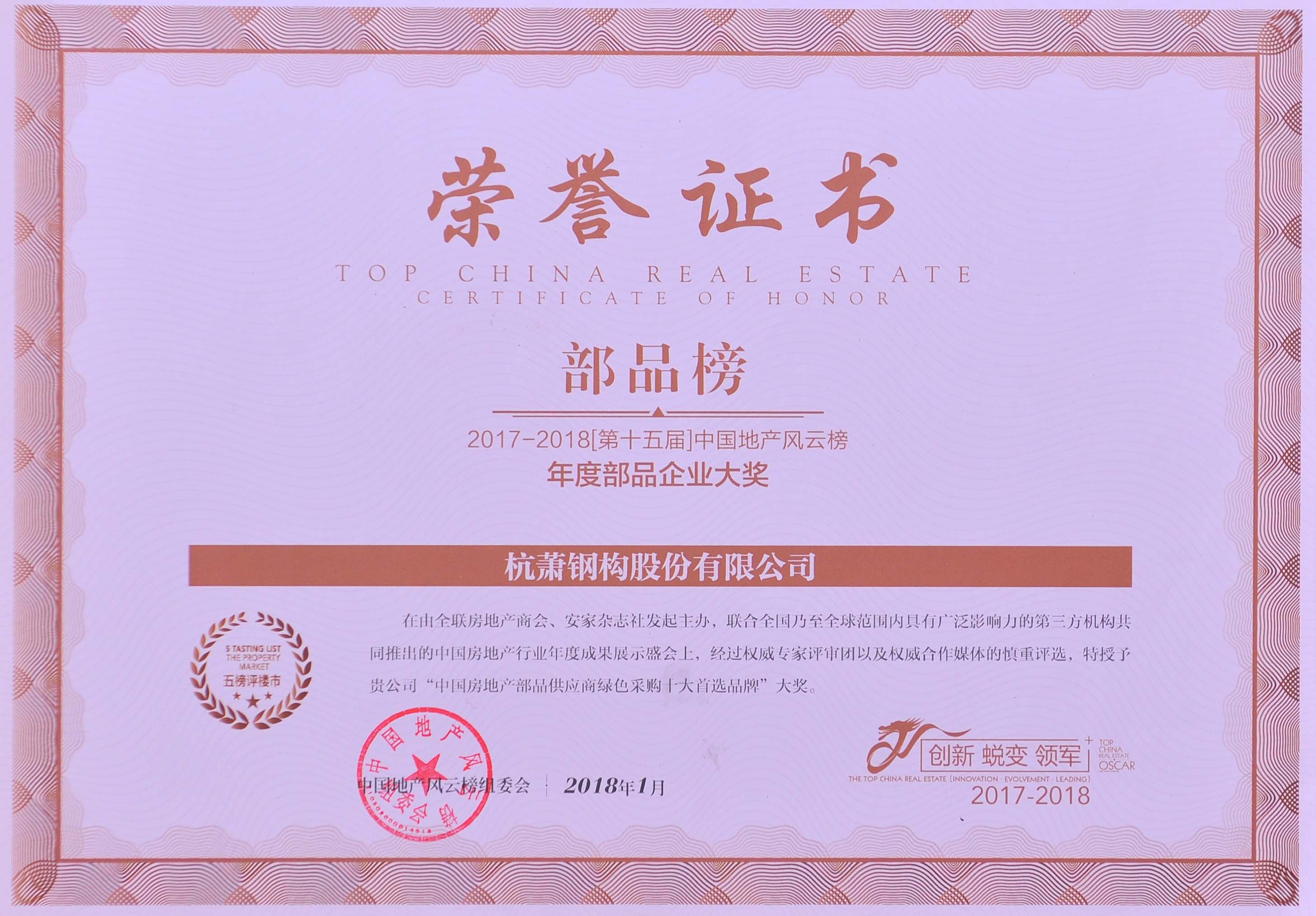 同期舉辦的2017-2018(第十五屆)中國(guó)地產(chǎn)風(fēng)云榜暨2018年第三屆中國(guó)房地產(chǎn)綠色采購(gòu)創(chuàng)新發(fā)展品牌峰會(huì)上,杭蕭鋼構(gòu)股份有限公司副總裁方鴻強(qiáng)致辭時(shí)說(shuō),杭蕭鋼構(gòu)希望能夠?qū)⒗麌?guó)利民的優(yōu)質(zhì)鋼結(jié)構(gòu)產(chǎn)品與全社會(huì)分享,共同推動(dòng)綠色發(fā)展、循環(huán)發(fā)展、低碳發(fā)展,促進(jìn)住宅建筑生產(chǎn)方式變革,引導(dǎo)建筑業(yè)、房地產(chǎn)業(yè)發(fā)展和轉(zhuǎn)型升級(jí),為社會(huì)創(chuàng)造更多價(jià)值。