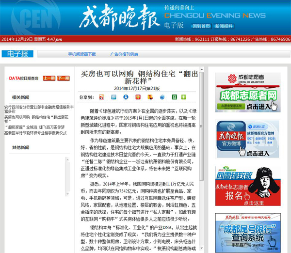2014年12月17日,《成都晚報(bào)》第21版《金融》報(bào)道:《買房也可以網(wǎng)購 鋼結(jié)構(gòu)住宅“翻出新花樣”》。