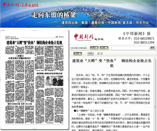 2014年12月26日,《中國新聞》第10版《專版》報道:《建筑業(yè)“大鱷”變“快魚” 鋼結(jié)構(gòu)企業(yè)搶占先機(jī)》。