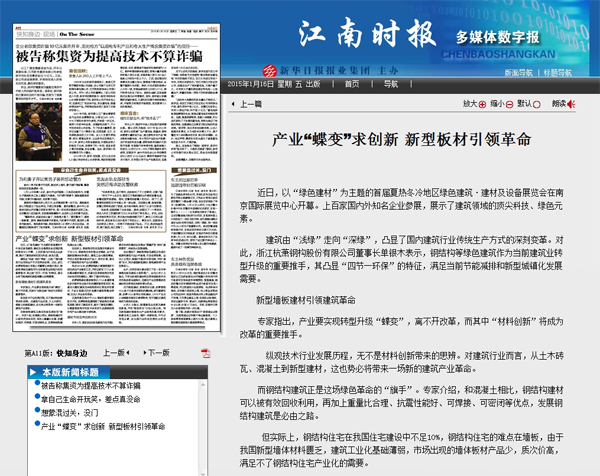 2015年1月16日,《江南時(shí)報(bào)》第A11版《快知身邊》報(bào)道:《產(chǎn)業(yè)“蝶變”求創(chuàng)新 新型板材引領(lǐng)革命》。