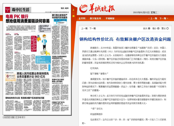 2015年1月21日,《羊城晚報》第A24版《珠中江生活》報道:《鋼構結構性價比高 有效解決棚戶區(qū)改造資金問題》。