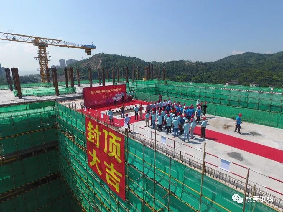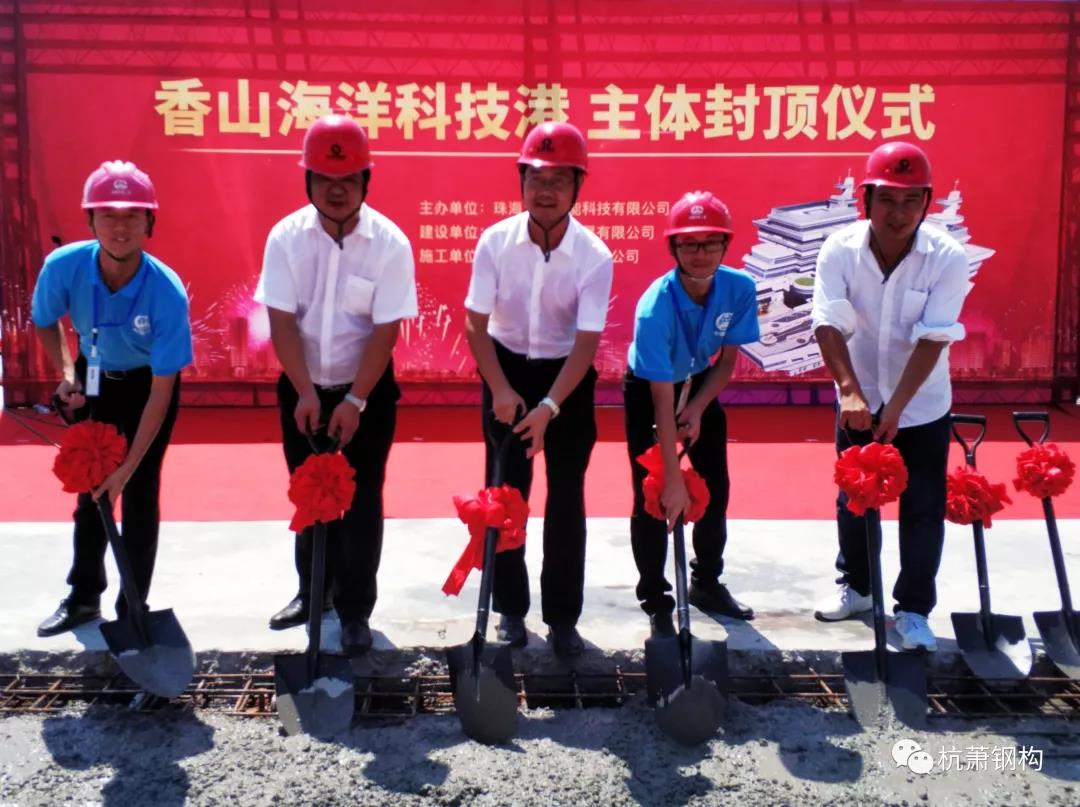 8月8日10時,零丁洋畔,由杭蕭鋼構(gòu)股份有限公司(以下簡稱“杭蕭鋼構(gòu)”)控股子公司——杭蕭鋼構(gòu)(廣東)有限公司(以下簡稱“廣東杭蕭”)承接的廣東省及珠海市重點工程項目:全國首個無人船基地(命名“香山海洋科技港”),在一派喜慶的氣氛中完成了最后一注混凝土澆筑,順利封頂!各方領(lǐng)導(dǎo)蒞臨現(xiàn)場出席了封頂儀式。