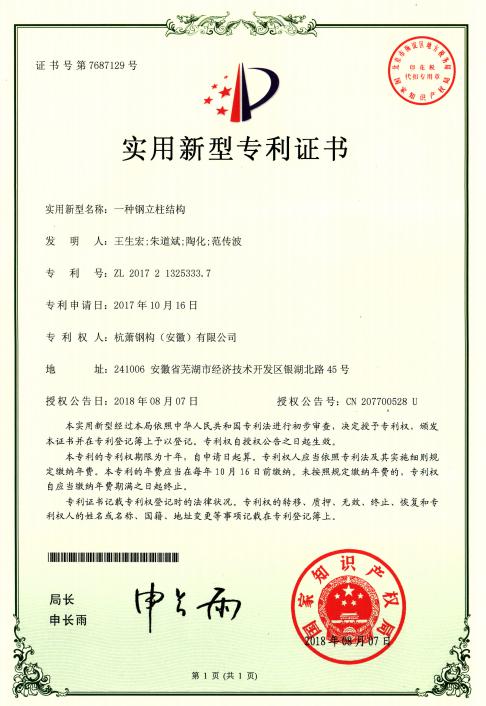 近日,杭蕭鋼構(gòu)股份有限公司(以下簡稱“杭蕭鋼構(gòu)”)全資子公司——?杭蕭鋼構(gòu)(安徽)有限公司(以下簡稱“安徽杭蕭”)“一種鋼立柱結(jié)構(gòu)”、“一種金屬屋面板順坡氣樓泛水板”兩項(xiàng)實(shí)用新型專利獲得國家知識(shí)產(chǎn)權(quán)局正式授權(quán)。