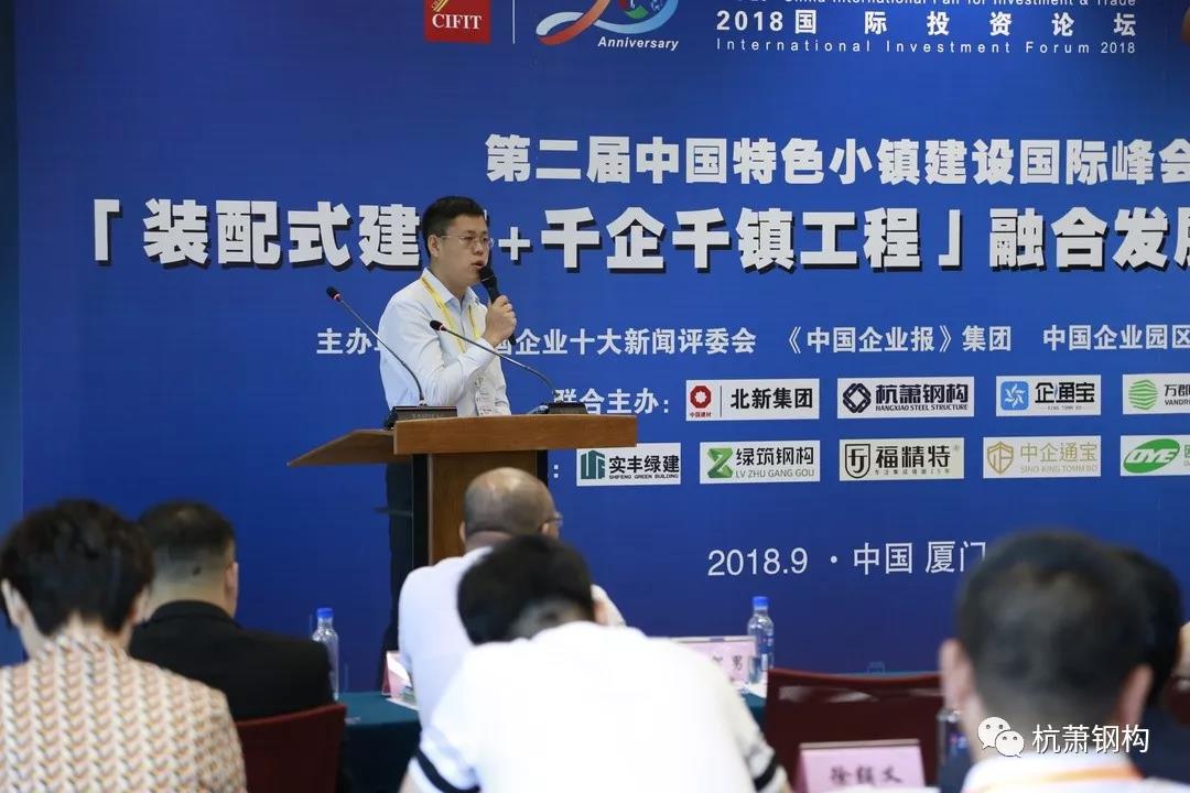 隨后,作為裝配式鋼結(jié)構(gòu)建筑引領(lǐng)者,由杭蕭鋼構(gòu)副總裁竇賀男應(yīng)邀作《杭蕭裝配式鋼結(jié)構(gòu)建筑 助推中國裝配式建筑產(chǎn)業(yè)快速發(fā)展》的主題演講,生動(dòng)展現(xiàn)了杭蕭以三十余年深耕技術(shù)為基石,不斷創(chuàng)新轉(zhuǎn)換為生產(chǎn)力進(jìn)行技術(shù)輸出,并通過現(xiàn)場視頻向與會(huì)來賓分享了“32層樓 58天建成”的裝配式鋼結(jié)構(gòu)建筑魅力。結(jié)合特色小鎮(zhèn)建設(shè),杭蕭鋼構(gòu)提出“House易建、Home難得”,向參會(huì)人員發(fā)起思考——小鎮(zhèn)不僅只有低層房,也有高層住宅。鋼結(jié)構(gòu)住宅具有的抗震性能優(yōu)、施工速度快、綠色環(huán)保等優(yōu)勢,滿足了對(duì)于“理想家園”的需求。