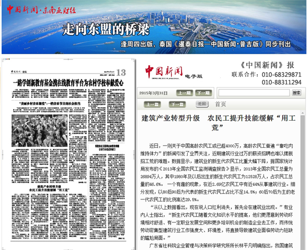 2015年3月31日,《中國新聞》報第13版《資訊》報道:《建筑產(chǎn)業(yè)轉(zhuǎn)型升級 農(nóng)民工提升技能緩解“用工荒”》。
