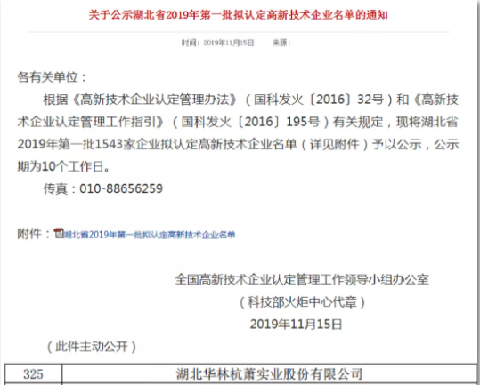 湖北華林杭蕭獲評2019年湖北省第一批認(rèn)定高新技術(shù)企業(yè)