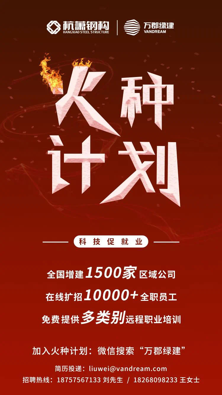 近日,全國各省市連日來紛紛出臺舉措,推動企業(yè)復(fù)工復(fù)產(chǎn)和穩(wěn)崗就業(yè)。2月23日,杭蕭鋼構(gòu)旗下綠色建筑B2B平臺萬郡綠建正式發(fā)布“火種計劃”——啟動全國萬人招聘,繼“科技戰(zhàn)疫”之后,發(fā)力“科技促就業(yè)”。