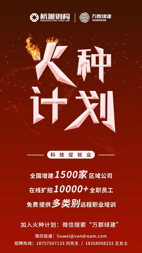 在此之后,萬郡綠建再次開辟第二戰(zhàn)場,發(fā)布以“科技促就業(yè)”為主題的火種計劃,啟動全國萬人招聘,繼“科技戰(zhàn)疫”之后,發(fā)力“科技促就業(yè)”。這一次的惠及群體從企業(yè)延伸到了更廣泛的個人。除了提升對企業(yè)的服務(wù)能力,萬郡綠建更希望通過這次計劃為更多的個人求職者提供一個機會,為復(fù)工復(fù)產(chǎn)促就業(yè)貢獻一點微薄的力量。