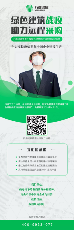 自2月2日起,國內(nèi)所有需求企業(yè)可申請免費獲享萬郡綠建會員權(quán)益,免費權(quán)限至2020年4月1日;同日起,萬郡綠建開通支持全國醫(yī)院建設(shè)的建材快速采購?fù)ǖ?,凡醫(yī)院建設(shè)需要的相關(guān)建材及湖北地區(qū)的建材采購,均以底價供應(yīng)并優(yōu)先快速保障供貨。自免費開放綠色建材供應(yīng)鏈在線解決系統(tǒng)以來,截至2月27日,萬郡綠建平臺已免費服務(wù)國內(nèi)需求企業(yè)406家。