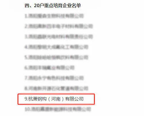 近日,為進(jìn)一步發(fā)揮重點(diǎn)企業(yè)的示范、引領(lǐng)作用,加快構(gòu)建現(xiàn)代產(chǎn)業(yè)體系,助推經(jīng)濟(jì)高質(zhì)量發(fā)展,按照“優(yōu)勝劣汰、動(dòng)態(tài)管理”的原則,河南省洛陽(yáng)市政府決定對(duì)市重點(diǎn)企業(yè)名單進(jìn)行調(diào)整。根據(jù)《洛陽(yáng)市人民政府關(guān)于調(diào)整洛陽(yáng)市重點(diǎn)企業(yè)名單的通知》(洛政【2020】13號(hào)),杭蕭鋼構(gòu)(河南)有限公司(以下簡(jiǎn)稱“河南杭蕭”)入選河南省洛陽(yáng)市重點(diǎn)企業(yè)名單。