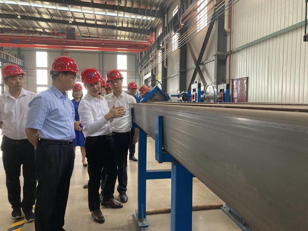 隨后,胡建新部長一行深入生產(chǎn)車間,了解各生產(chǎn)線、工藝流程及項(xiàng)目在施工過程中采用的先進(jìn)工藝等,聽取了陳丹總經(jīng)理關(guān)于湖南凱博杭蕭基本情況、產(chǎn)品體系,及承建的湘陰金龍鎮(zhèn)限價(jià)定向商品房、湘陰縣旭東學(xué)校等鋼結(jié)構(gòu)裝配式住宅項(xiàng)目建設(shè)情況的匯報(bào)。對于湘陰縣政府在鋼結(jié)構(gòu)裝配式建筑產(chǎn)業(yè)方面的重視程度及支持力度、以及湖南凱博杭蕭在裝配式建筑市場上的優(yōu)勢,胡建新部長給予了充分肯定,同時(shí)鼓勵(lì)湖南凱博杭蕭要抓住城市建設(shè)和國家鼓勵(lì)裝配式建筑發(fā)展的大好歷史機(jī)遇,快速推進(jìn)公司持續(xù)發(fā)展。