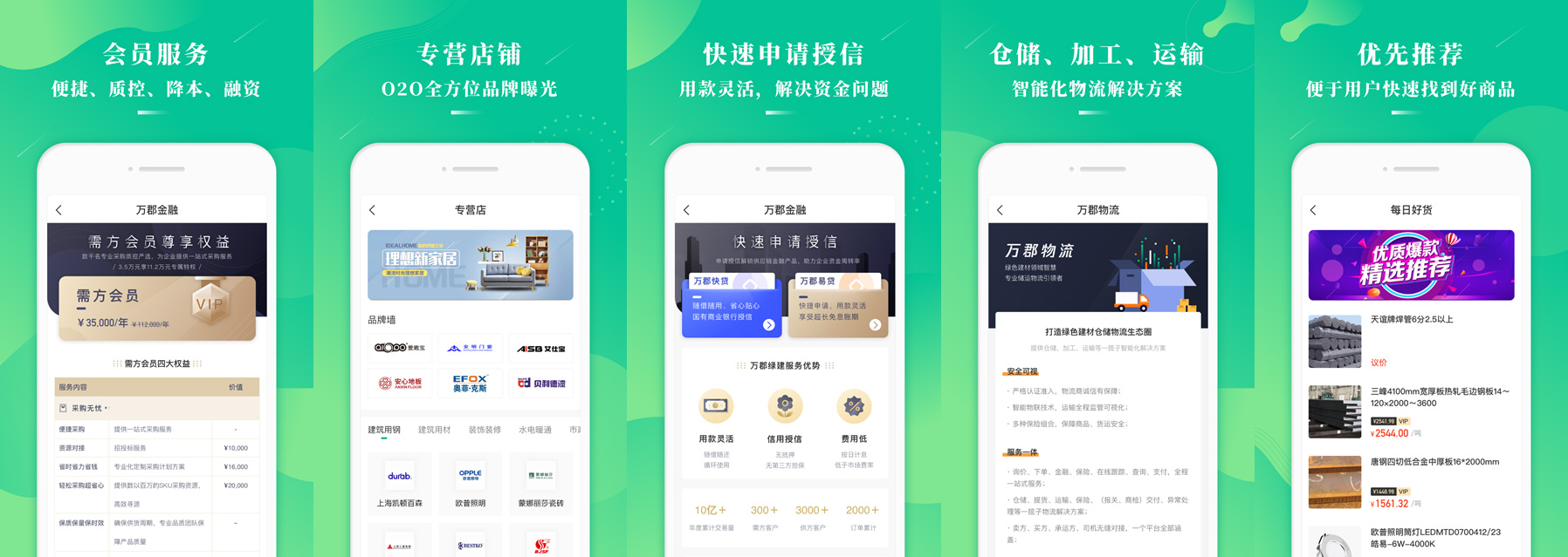 在萬(wàn)郡易采APP,用戶(hù)輕觸手指,即可隨時(shí)隨地盡覽全平臺(tái)數(shù)十萬(wàn)SKU,并可暢享全天候選型選樣、一站式采購(gòu)以及高效的資源對(duì)接,無(wú)論是在出差途中還是回家路上,建筑建材采購(gòu)人員打開(kāi)萬(wàn)郡易采就能隨時(shí)隨地選型選樣、搜索產(chǎn)品、下單交易,隨時(shí)隨地暢享移動(dòng)化交易的便捷。對(duì)于供方客戶(hù),更可通過(guò)萬(wàn)郡易采APP為公司產(chǎn)品贏得更多曝光機(jī)會(huì),讓優(yōu)質(zhì)商品不再銷(xiāo)路難尋,有物流需求或物流資源的用戶(hù),還可通過(guò)萬(wàn)郡易采APP的一鍵對(duì)接服務(wù),與萬(wàn)郡綠建共同打造綠色建材倉(cāng)儲(chǔ)物流生態(tài)圈。此外,萬(wàn)郡易采APP的發(fā)現(xiàn)頻道還為廣大行業(yè)從業(yè)人員提供了豐富的資訊閱讀功能,從行業(yè)資訊到國(guó)家政策、從活動(dòng)信息到建材知識(shí),為用戶(hù)打造了專(zhuān)屬的行業(yè)”頭條“,更有豐富的供應(yīng)鏈金融服務(wù)產(chǎn)品,能夠更加快捷的解決建筑、建材行業(yè)供需企業(yè)融資難的問(wèn)題,降低企業(yè)融資成本,加快資金周轉(zhuǎn)速度,幫助企業(yè)贏得更多收益。