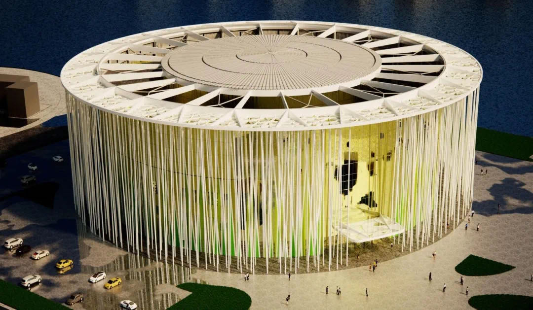 項(xiàng)目地上3層,地下2層,主鋼屋蓋結(jié)構(gòu)高度約36米,下部主體結(jié)構(gòu)為鋼筋混凝土框架——剪力墻結(jié)構(gòu)體系,鋼屋蓋為帶中央過度環(huán)的徑向鋼桁架及懸挑梁結(jié)構(gòu),桁架平面直徑62米,外圍懸挑10米,懸挑結(jié)構(gòu)下方設(shè)置吊掛鋼管仿竹柱。
