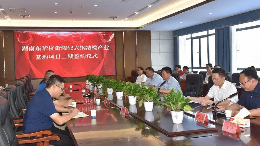 簽約儀式上,趙瑞華書記對湖南東華杭蕭裝配式鋼結構產業(yè)基地項目二期的基本情況進行了簡單介紹,湖南東華杭蕭董事長李余良向與會領導就項目二期的主要經濟指標、生產工藝、產品性能及優(yōu)勢進行了匯報。
