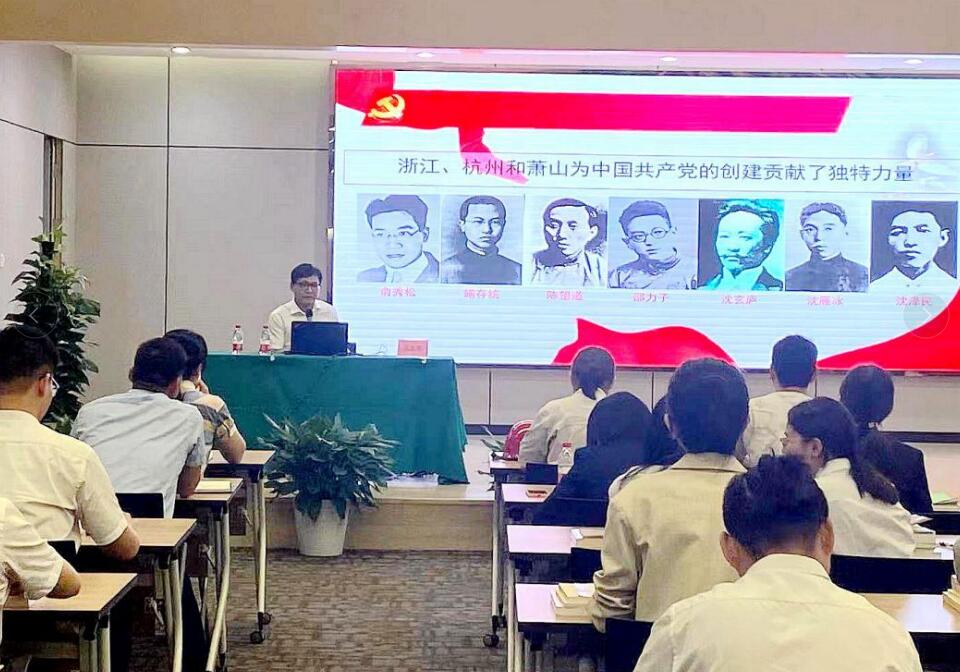 為落實(shí)浙江省委、杭州市委、蕭山區(qū)委關(guān)于開(kāi)展黨史學(xué)習(xí)教育的部署要求,12日上午,黨史學(xué)習(xí)教育蕭山區(qū)委宣講團(tuán)來(lái)到新街街道,走進(jìn)杭蕭鋼構(gòu)股份有限公司研發(fā)大樓舉辦專場(chǎng)報(bào)告會(huì)。蕭山區(qū)委黨史研究室(區(qū)志辦)副主任汪志華出席報(bào)告會(huì)并作專題宣講,街道黨工委委員俞紅霞主持宣講會(huì),杭蕭鋼構(gòu)黨員同志、團(tuán)員青年、入黨積極分子、各群團(tuán)組織代表、新階層人士代表等到場(chǎng)聆聽(tīng)學(xué)習(xí)。