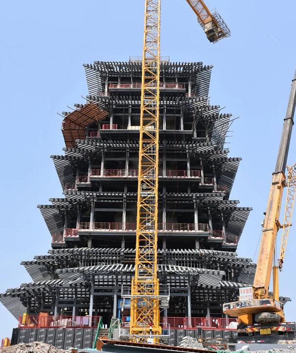 ?江蘇中天杭蕭施工建造的徐州市石山消防瞭望塔(呂梁閣)項(xiàng)目總建筑面積約4135㎡,地下建筑面積1183㎡,地上建筑面積2952㎡。本工程地上共七層,地下一層,結(jié)構(gòu)形式為混凝土核心筒剪力墻+鋼框架結(jié)構(gòu),基礎(chǔ)為平板式筏板基礎(chǔ)。結(jié)構(gòu)中心設(shè)置混凝土剪力墻筒體,核心筒高度升至屋面。整體結(jié)構(gòu)南北向40.2m,東西向35.2m?;A(chǔ)標(biāo)高為-6.850m。結(jié)構(gòu)共計(jì)7層檐口,其中檐口鋼椽約2100余件,桁架梁約1300余件,鋼梁約1500余件,鋼柱約300余件。