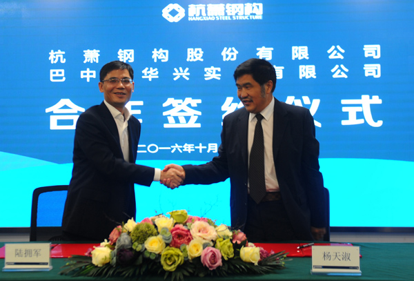 ↑杭蕭鋼構(gòu)副總裁陸擁軍與華興實(shí)業(yè)有限公司董事長(zhǎng)楊天淑共同簽署戰(zhàn)略合作協(xié)議