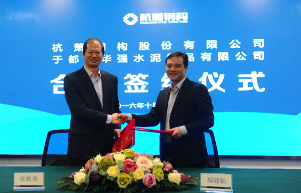 ↑杭蕭鋼構(gòu)總裁張振勇與于都華強(qiáng)董事長(zhǎng)鄢建強(qiáng)共同簽署戰(zhàn)略合作協(xié)議。