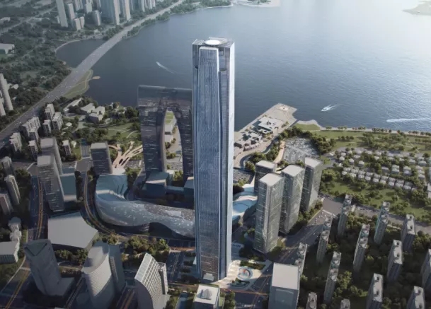 該項目位于江蘇省蘇州市蘇州工業(yè)園區(qū)金雞湖畔,樓高499.15m,地上103層,地下6層;塔樓地上部分豎向共分11個區(qū),1-3區(qū)為甲級辦公區(qū),4區(qū)為酒店和公寓式酒店,5-8區(qū)為酒店式公寓,9-10區(qū)為公寓式酒店;辦公標準層層高4.5m,酒店式公寓及公寓式酒店標準層層高4.35m,首層大堂層高15.5m。