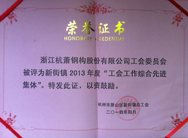 近日,新街鎮(zhèn)總工會(huì)召開了2013年度工會(huì)工作先進(jìn)集體和先進(jìn)個(gè)人表彰大會(huì),浙江杭蕭鋼構(gòu)股份有限公司工會(huì)被評(píng)為2013年度“工會(huì)工作綜合先進(jìn)集體”,職工黃志偉被評(píng)為2013年度“優(yōu)秀職工”稱號(hào)。