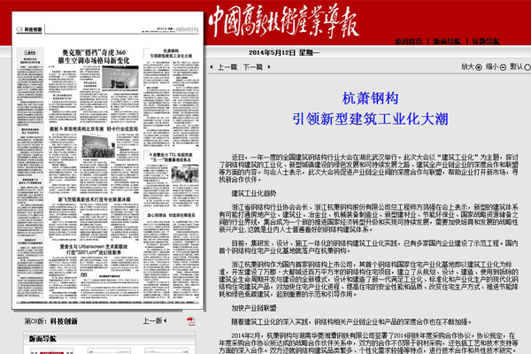2014年5月12日,《中國(guó)高新技術(shù)產(chǎn)業(yè)導(dǎo)報(bào)》C8版《科技創(chuàng)新》報(bào)道:《杭蕭鋼構(gòu)引領(lǐng)新型建筑工業(yè)化大潮》。