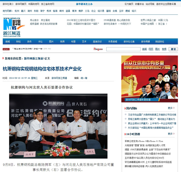 2014年9月10日,《新華網(wǎng)浙江頻道》報(bào)道:《杭蕭鋼構(gòu)實(shí)現(xiàn)鋼結(jié)構(gòu)住宅體系技術(shù)產(chǎn)業(yè)化? 杭蕭鋼構(gòu)與河北世人美石簽署合作協(xié)議》。