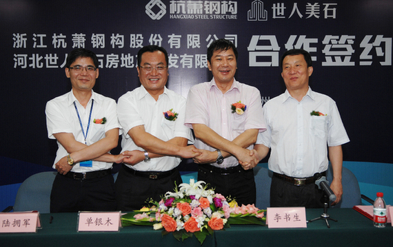 9月9日,浙江杭蕭鋼構(gòu)股份有限公司(簡稱“杭蕭鋼構(gòu)”)與河北世人美石房地產(chǎn)開發(fā)有限公司(簡稱“世人美石公司”)鋼結(jié)構(gòu)住宅體系(含鋼管束住宅組合結(jié)構(gòu))合作協(xié)議簽約儀式在杭蕭鋼構(gòu)總部瑞豐國際商務(wù)大廈舉行。杭蕭鋼構(gòu)董事長單銀木、世人美石公司董事長周新太、河北省邯鄲市涉縣縣委書記李書生、副縣長路正陽等領(lǐng)導(dǎo)參加了簽約儀式。