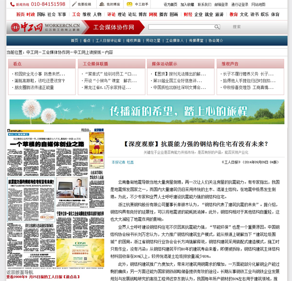 2014年9月9日,《工人日?qǐng)?bào)》第04版《經(jīng)濟(jì)新聞》報(bào)道:《抗震能力強(qiáng)的鋼結(jié)構(gòu)住宅有沒(méi)有未來(lái)?》。