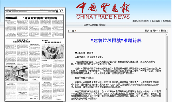 2014年9月11日,《中國貿(mào)易報》第07版《公司治理》報道:《“建筑垃圾圍城”難題待解》