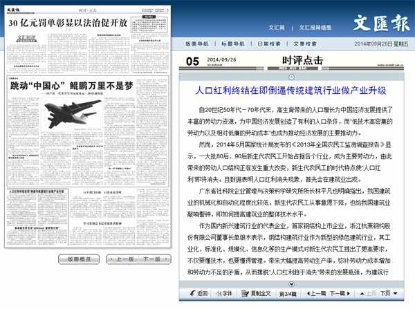 2014年9月26日,《文匯報(bào)》第5版《時(shí)評(píng)·點(diǎn)擊》報(bào)道:《人口紅利終結(jié)在即倒逼傳統(tǒng)建筑行業(yè)做產(chǎn)業(yè)升級(jí)》。