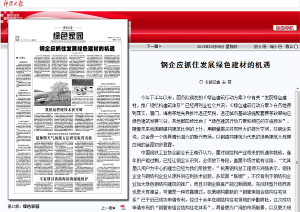 2014年10月9日,《科技日?qǐng)?bào)》第12版《綠色家園》報(bào)道:《鋼企應(yīng)抓住發(fā)展綠色建材的機(jī)遇》。
