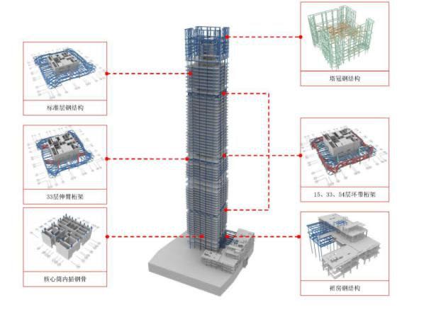 該工程鋼結(jié)構(gòu)設(shè)計(jì)涵蓋了伸臂桁架、環(huán)帶桁架、勁性混凝土柱、鋼管混凝土柱、鋼板剪力墻、空間結(jié)構(gòu)塔冠和超薄鋼筋桁架樓層板等各種結(jié)構(gòu),設(shè)計(jì)復(fù)雜,施工難度大;成為漢德邦建材2020年首個(gè)鋼筋桁架樓承板重點(diǎn)代表性項(xiàng)目。