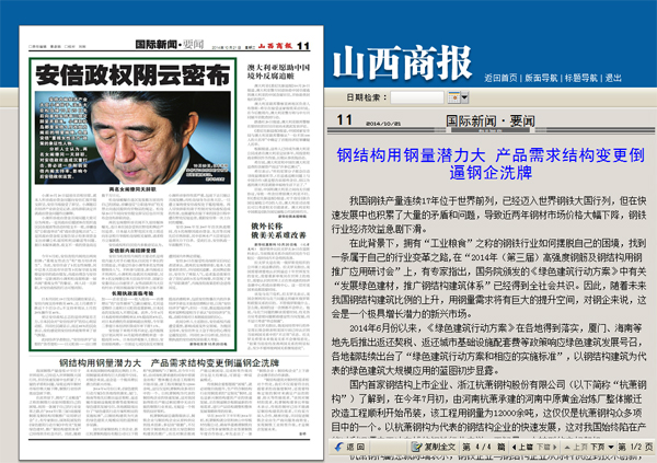 2014年10月21日,《山西商報(bào)》第11版《國(guó)際新聞·要聞》報(bào)道:《鋼結(jié)構(gòu)用鋼量潛力大 產(chǎn)品需求結(jié)構(gòu)變更倒逼鋼企洗牌》。