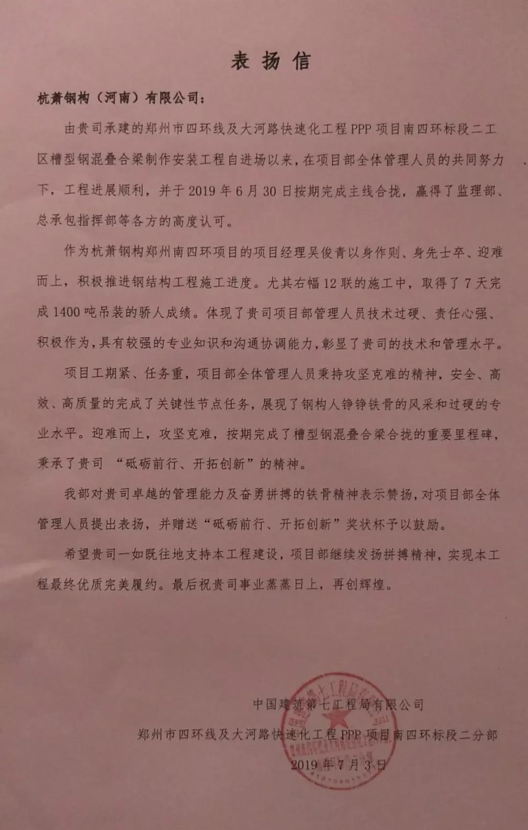河南杭蕭收到業(yè)主方表?yè)P(yáng)信及獎(jiǎng)勵(lì)獎(jiǎng)杯